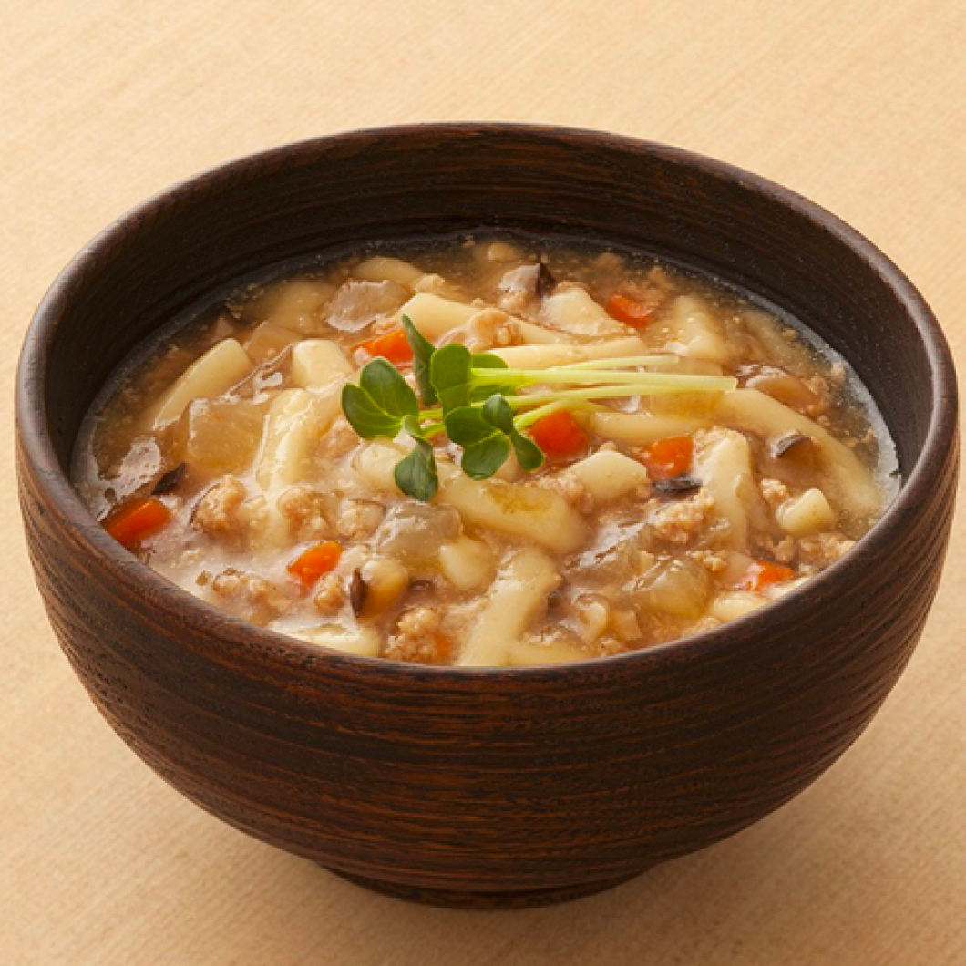 Soft pork, radish, burdock, carrot, shiitake, and fried udon. Udon is shortened so that it is easy to eat.
