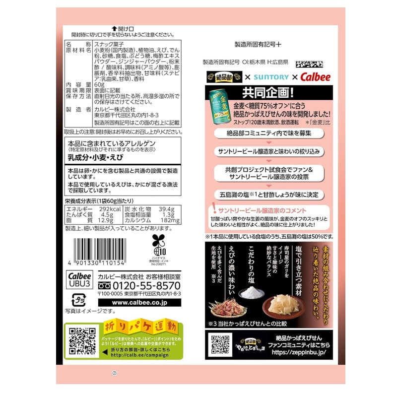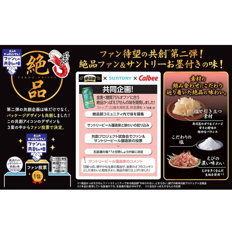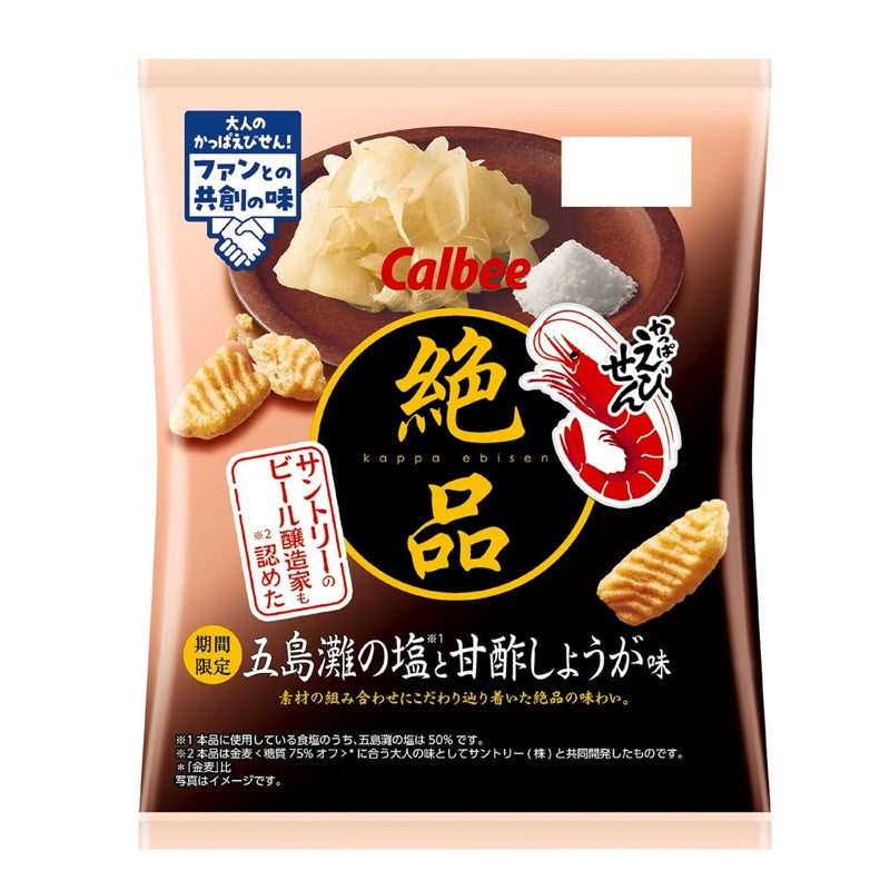 this premium version of kappaebisen features a stronger shrimp flavor and a thicker, crunchier texture than the standard variety. developed together with fans and suntory to pair perfectly with beer, this flavor highlights gotonada sea salt and sweet pickled ginger inspired by sushi restaurants. *50% of the salt used is produced in gotonada. *jointly developed with suntory for an adult taste that matches beer.