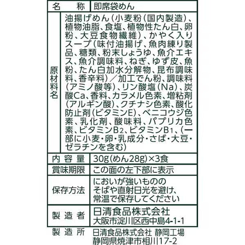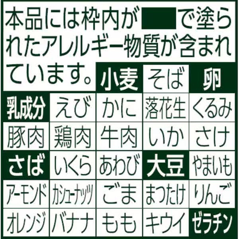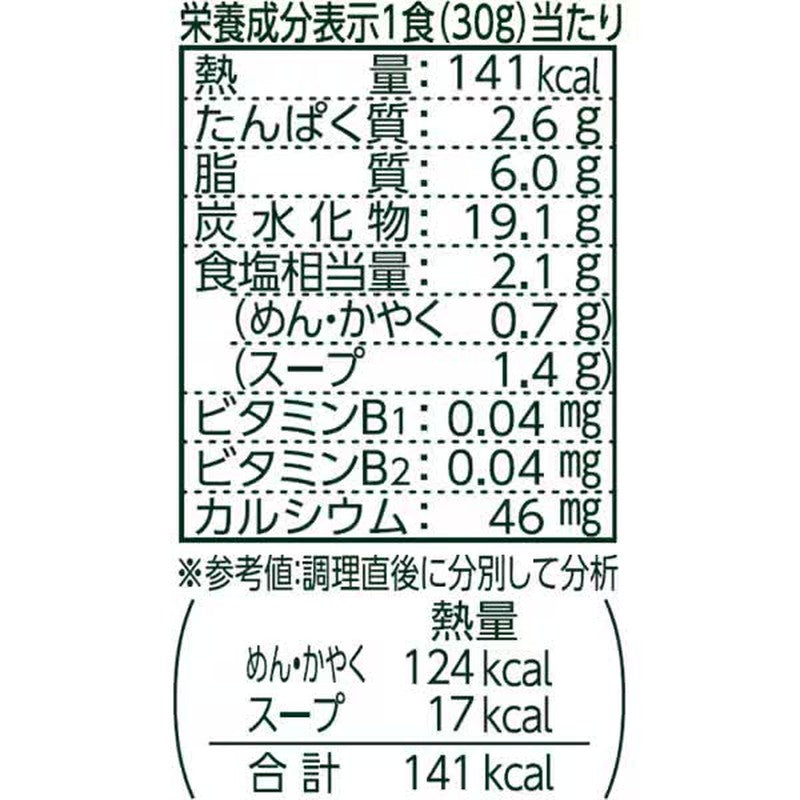 | Other | Gelatin Milk Eggs Soybeans Wheat Nutritional information:141kcal *Energy 2.1g *Salt equivalent (noodles and toppings: 0.7g / soup: 1.4g) 2.6g *Protein 6.0g *Fat 6.0g *Carbohydrates Ingredients:Fried noodles (wheat flour, vegetable oil, salt, vegetable protein, egg powder, soybean dietary fiber), soup with toppings (seasoned fried tofu, fish paste product, sugar, powdered soy sauce, seafood extract, seafood seasoning, green onion, yuzu peel, fish meal, protein hydrolyzate, kelp seasoning, spices)/modified starch, seasoning (amino acids, etc.), phosphate (Na), calcium carbonate, flavoring, caramel coloring, Thickener (alginic acid), gardenia color, antioxidant (vitamin E), emulsifier, monascus color, acidulant, paprika color, vitamin B2, vitamin B1, (contains wheat, eggs, milk components, mackerel, soybeans, gelatin) Ingredient analysis table (per 30g serving):Calories 141kcal, protein 2.6g, fat 6.0g, carbohydrates 19.1g, salt equivalent 2.1g |