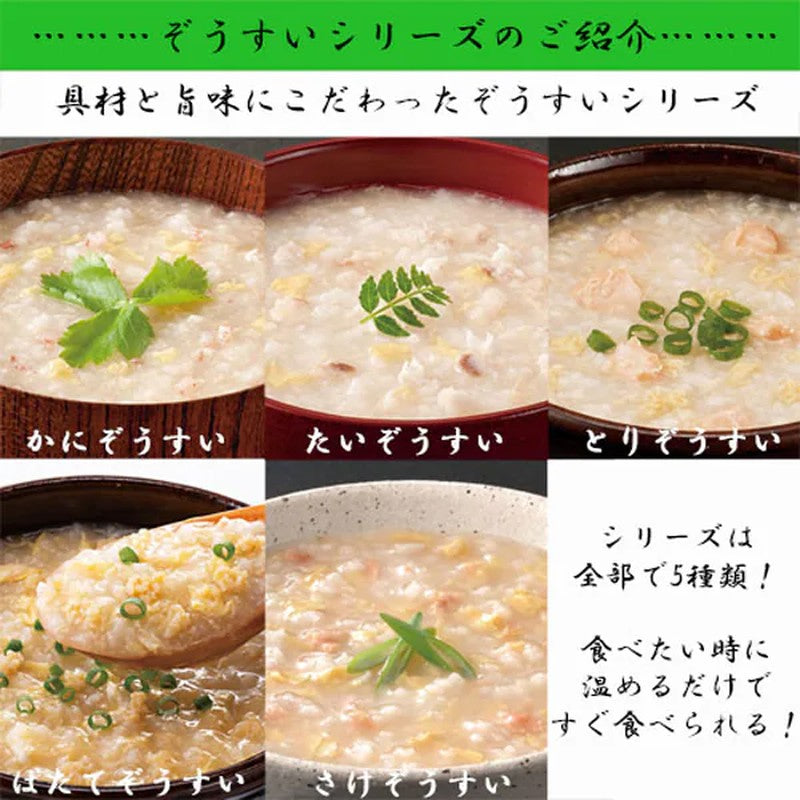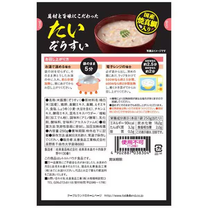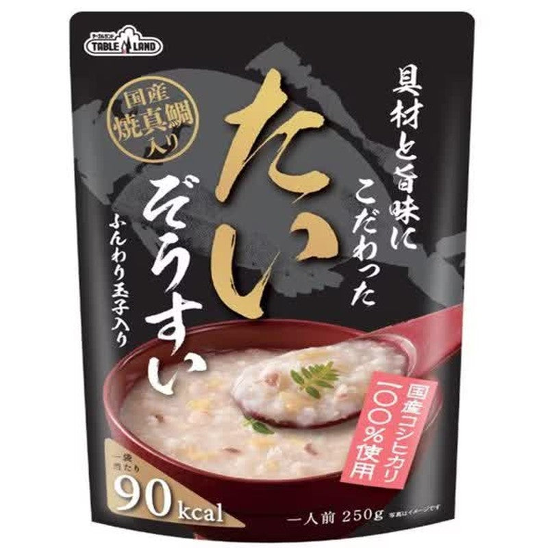 Tai porridge with special attention to ingredients and flavor We use grilled red sea bream from Japan, and we've paid special attention to the aroma and flavor. This is a savory porridge with the original taste of sea bream.