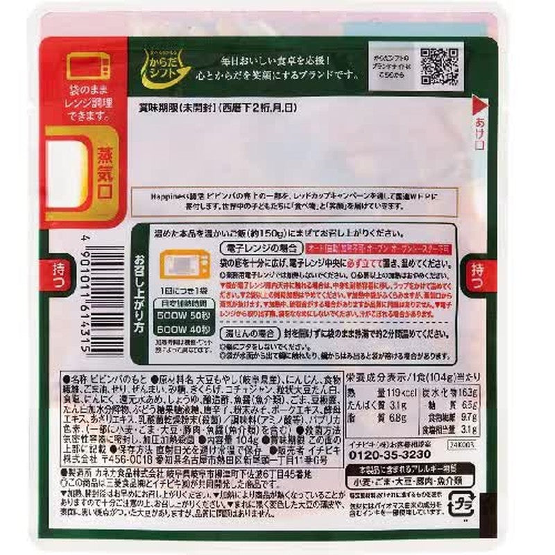 Allergens used in this product: Wheat, sesame, soybeans, pork, fish sauce (seafood) Ingredients: Soybean sprouts (from Gifu Prefecture), carrots, dietary fiber, sesame oil, Japanese parsley, fern, sugar, wood ear mushrooms, gochujang, granular soy protein, salt, garlic, reduced starch syrup, soy sauce, brewed vinegar, fish sauce (seafood), sesame, chili bean paste, protein hydrolysate, glucose fructose liquid sugar, chili pepper, powdered miso, pork extract, yeast extract, clam extract, dried lactic acid bacteria powder (sterilized)/seasoning (amino acids, etc.), paprika coloring, (contains wheat, sesame, soybeans, pork, fish sauce (seafood)) Origin: Japan Storage method: Store at room temperature away from direct sunlight. Nutritional information (per 104g serving):Calories 119kcal, protein 3.1g, fat 6.8g, carbohydrates 16.3g, sugar 9.7g, dietary fiber 0.0g, salt equivalent 3.1g |