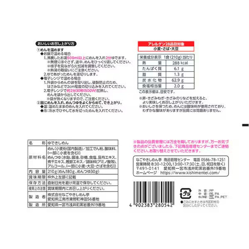 Product specifications for Nagoya Kishimentei's Microwave-safe Boiled Mixed Kishimen 210g