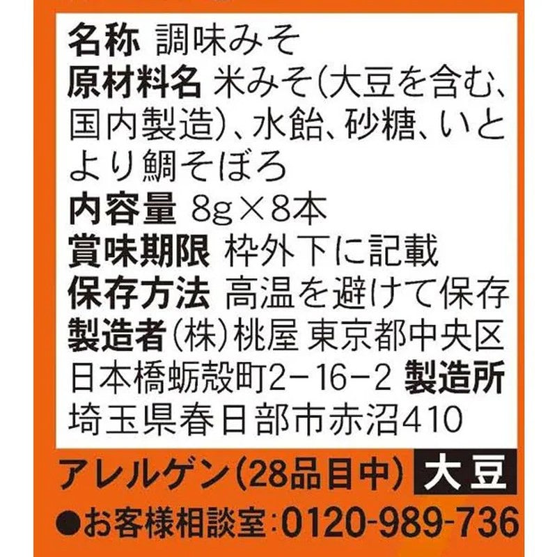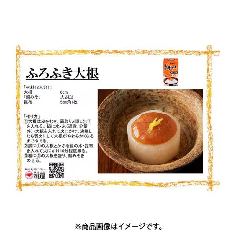 Ingredients:Rice miso, sugar, minced sea bream, starch syrup Allergy information:Soybeans Nutritional values __(per 100g) Energy: 252kcal Protein: 6.5g Fat: 2.7g Carbohydrates: 50.3g Sugar: 47.8g Dietary fiber: 2.5g Sodium: 2.0g Sodium equivalent: 5.1g |