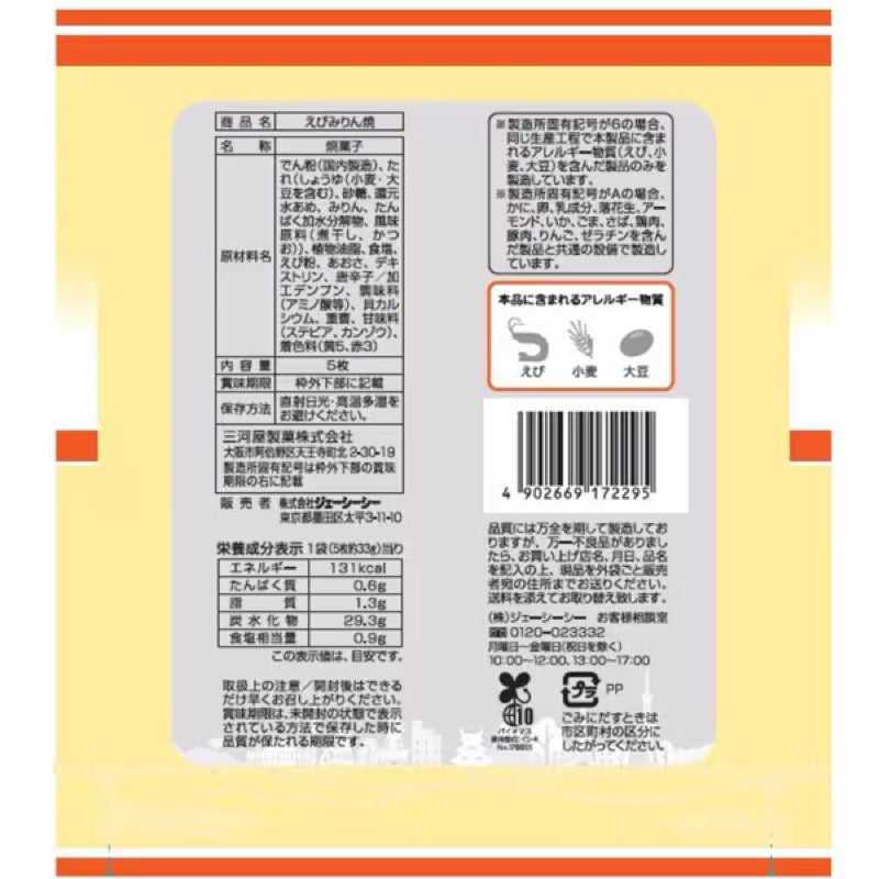 Contents: 5 pieces Name: Baked Goods Ingredients: Starch (Made in Japan), Sauce (Soy Sauce (Contains Wheat and Soybeans), Sugar, Reduced Sugar, Starch Syrup, Mirin, Protein Hydrolyzate, Flavoring (Dried Sardines, Bonito)), Vegetable Oil, Salt, Shrimp Powder, Green Laver, Dextrin, Chili Pepper Modified starch, seasonings (amino acids, etc.), shellfish calcium, baking soda, sweeteners (stevia, licorice), colorings (Yellow 5, Red 3). Storage Instructions: Avoid direct sunlight, high temperatures, and humidity. Nutritional Information: Per bag (5 pieces, approximately 33g): Energy 131kcal, Protein 0.6g, Fat 1.3g, Carbohydrates 29.3g, Sodium Equivalent 0.9g *These values are for reference only. Allergens: Shrimp, wheat, soybeans |