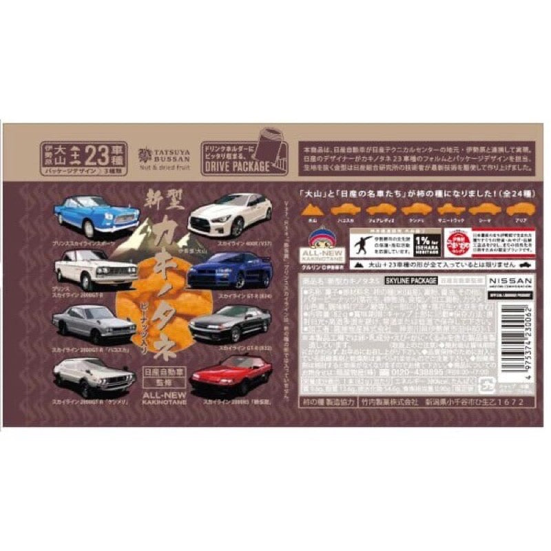 This product was created by Nissan Motor Co., Ltd. in collaboration with Isehara, the home of the Nissan Technical Center. Persimmon seeds were created in the shapes of 23 Nissan models and in the shape of Mt. Oyama in Isehara. Peanuts included.
