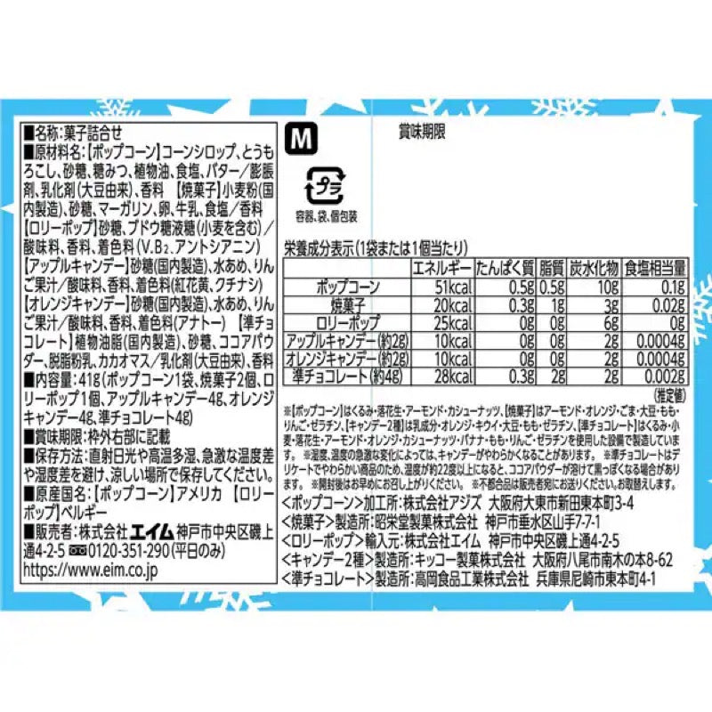 Net Weight:41g Name:Assorted Confectionery Ingredients: [Popcorn] Corn syrup, corn, sugar, molasses, vegetable oil, salt, butter/leavening agent, emulsifier (soy-derived), flavoring [Baked Goods] Wheat flour (domestically produced), sugar, margarine, eggs, milk, salt/flavoring [Lollipop] Sugar, glucose syrup (contains wheat)/acidulant, flavoring, coloring (V.B2, annealing) Apple Candy: Sugar (Made in Japan), Corn Syrup, Apple Juice/Acidulant, Flavoring, Coloring (Safflower Yellow, Gardenia) Orange Candy: Sugar (Made in Japan), Corn Syrup, Apple Juice/Acidulant, Flavoring, Coloring (Annatto) Semi-Chocolate: Vegetable Oil (Made in Japan), Sugar, Cocoa Powder, Skim Milk Powder, Cocoa Mass/Emulsifier (Soy-derived), Flavoring Storage Instructions: Store in a cool place away from direct sunlight, high temperatures and humidity, and sudden changes in temperature and humidity. Nutritional Information [per bag or item]: Energy: Popcorn 51kJ, Baked Goods 20kJ, Lollypop 25kJ, Apple Candy 10kJ, Orange Candy 10kJ, Chocolate 28kcal; Protein: Popcorn 0kJ, Baked Goods 0kJ, Lollypop 0kJ, Apple Candy 0kJ, Orange Candy 0kJ, Chocolate 0.3g; Fat: Popcorn 0kJ, Baked Goods 1kJ, Lollypop 0kJ, Apple Candy 0kJ, Orange Candy 0kJ, Chocolate 2.1g; Carbohydrates: Popcorn 10kJ, Baked Goods 3kJ, Lollypop 6kJ, Apple Candy 2kJ, Orange Candy 2kJ, Chocolate 2g; Sodium Equivalent: Popcorn 0.0943kJ, Baked Goods 0.0203kJ, Lollypop 0kJ, Apple Candy 0kJ, Orange Candy 0kJ, Chocolate 0g Food Allergies: Eggs, Milk, Wheat, Soybeans, Apple |
