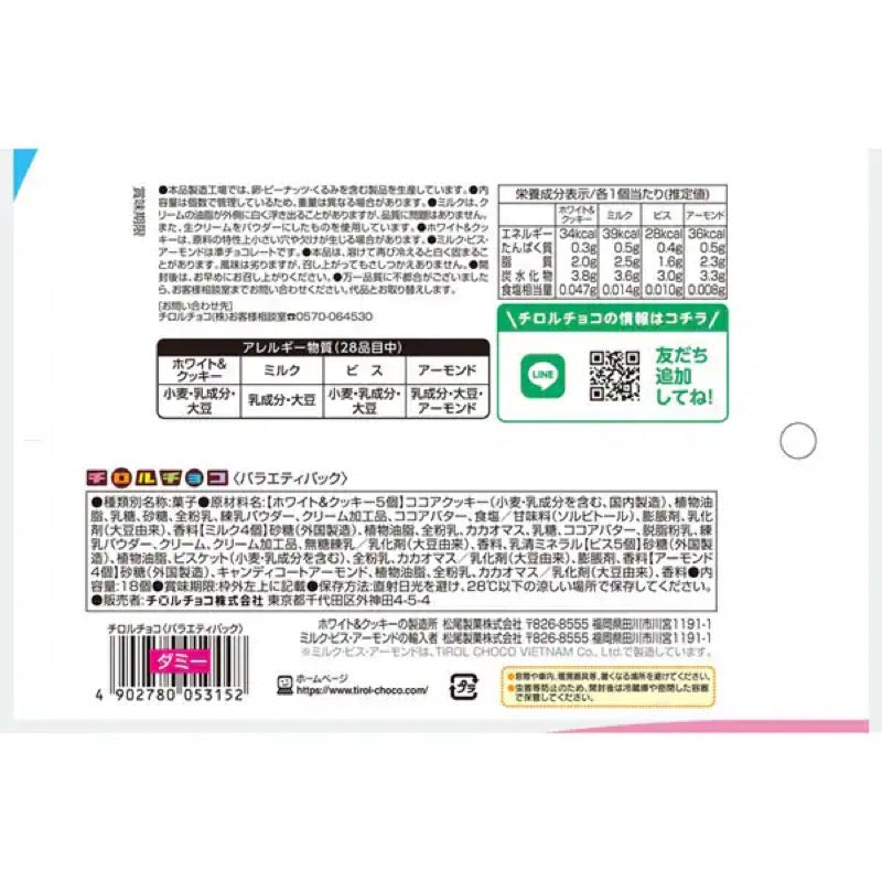 Contents:18 pieces Name: Type: Confectionery Ingredients: [White & Cookies 5 pieces] Cocoa Cookies (contains wheat and milk ingredients, made in Japan), vegetable oil, lactose, sugar, whole milk powder, condensed milk powder, processed cream, cocoa butter, salt/sweetener (sorbitol), leavening agent, emulsifier (soybean-derived), flavoring [Milk 4 pieces] Sugar (made overseas), vegetable oil, whole milk powder, cocoa mass, lactose, cocoa Butter, skim milk powder, condensed milk powder, cream, processed cream, evaporated milk/emulsifier (soy-derived), flavoring, whey minerals. [5 Biscuits] Sugar (imported), vegetable oil, biscuits (contains wheat and dairy ingredients), whole milk powder, cocoa mass/emulsifier (soy-derived), leavening agent, flavoring. [4 Almonds] Sugar (imported), candy-coated almonds, vegetable oil, whole milk powder, cocoa mass/emulsifier (soy-derived), flavoring. Storage Instructions: Avoid direct sunlight and store in a cool place below 28°C. Nutritional Information (per piece) White & Cookie: Energy 34kcal, Protein 0.3g, Fat 2.0g, Carbohydrates 3.8g, Sodium equivalent 0.047g Milk: Energy: 39kcal, Protein 0.5g, Fat 2.5g, Carbohydrates 3.6g, Sodium equivalent 0.014g |