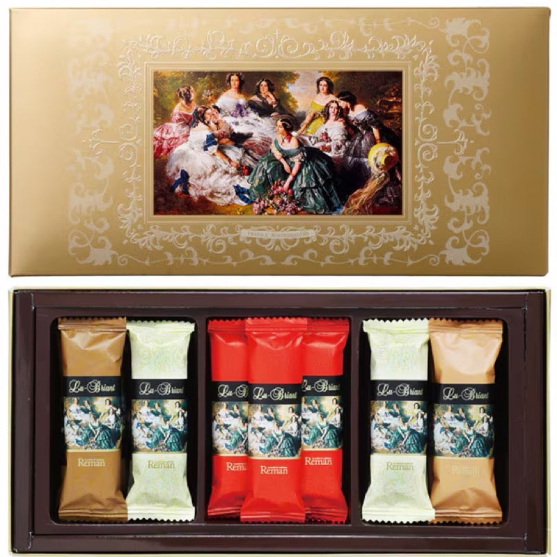 A long-selling product with over 50 years of history, Reman boasts "Louvrian," an assortment of four types of chocolate confectionery. This traditional chocolate assortment is synonymous with Reman. It comes in a box decorated with a European painting. Perfect for home use or as a gift. It arrives wrapped in Louvrian logo wrapping paper.
