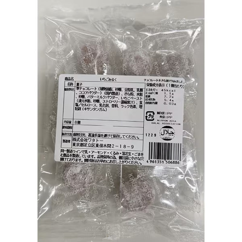 Contents:8 pieces Name:Confectionery Ingredients:Semi-chocolate (vegetable oil, sugar, whole milk powder, lactose, cocoa powder) (Made in Japan), soybean flour, starch syrup, sugar, buttermilk powder, strawberry paste (reduced starch syrup, sugar, concentrated strawberry juice), salt/cellulose, emulsifier, flavoring, lac color, thickener (xanthan gum) Storage:Store away from direct sunlight, high temperatures, and humidity. Nutritional Information:(per piece): Energy 45kcal, Protein 1.1g, Fat 2.2g, Carbohydrates 5.4g, Sodium equivalent 0.03g Allergens used in this product:Milk, soybeans, strawberries |