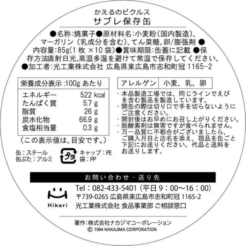 The popular "Frog Pickles" now comes in a new canned emergency food! This can contains 10 individually wrapped sable cookies shaped like cute pickle faces. The long-lasting storage allows you to enjoy the smiles of the cute pickles while preparing for emergencies.