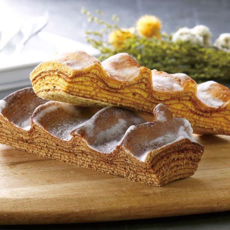 This set includes two baumkuchen: one with finely chopped orange peel kneaded into the dough, and the other with a bitter, fragrant coffee flavor. It pairs well with coffee, black tea, and even green tea, making it a delight for any occasion.