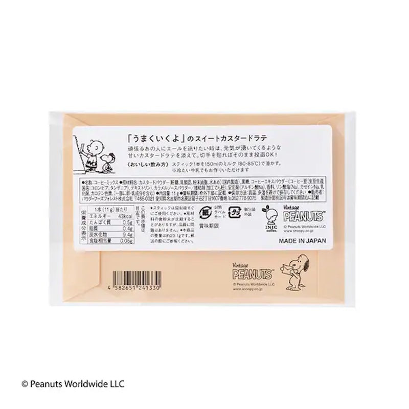 A letter coffee to express your gratitude to a special someone. When you need a little encouragement. Serve that special someone with a sweet custard latte, which will lift their spirits and lift their spirits. The rich aroma of freshly made custard is also soothing. Simply write your message in the postcard-sized envelope, attach a stamp, and send it right away. It comes with a cute Snoopy-patterned coaster with instructions on how to drink it, making it sure to add a touch of fun to the recipient's coffee time. Storage Instructions - Store in a cool, dry place. - Use the sticks immediately after opening. - Fine coffee powder may settle during dissolution, but this does not affect the quality. - This product is a powder with a low moisture content and low water activity, ensuring consistent quality and safe consumption until the expiration date.