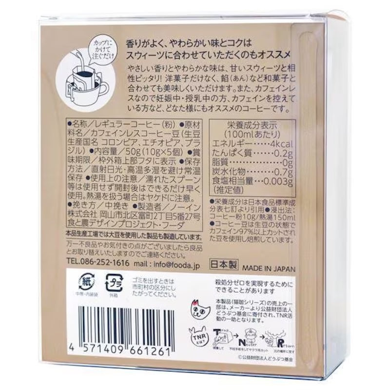 A must-have for cat lovers! This decaffeinated coffee comes in cute cat packaging. - A gentle blend of sweetness and aroma. With a well-balanced richness, aroma, and bitterness, it's easy to drink. - Delicious black, but also pairs well with milk and sugar, so you can enjoy it however you like. This is a simple and convenient drip bag. *Please note that the individual packaging for the 5-pack is plain. *The manufacturer donates a portion of sales to the Animal Fund (Public Interest Incorporated Foundation).