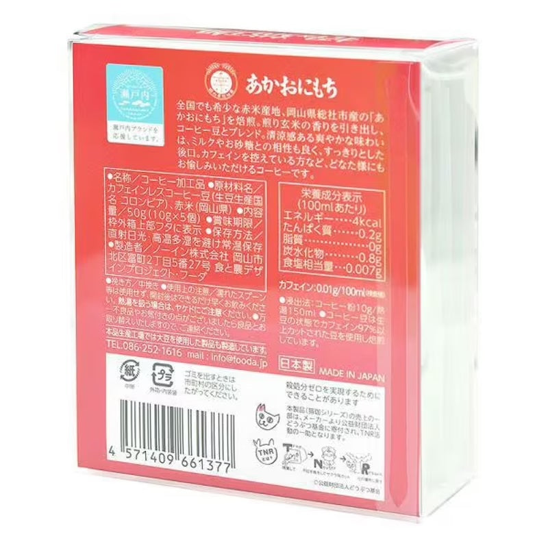 A must-have for cat lovers! This caffeine-free coffee comes in cute cat packaging. - This caffeine-free coffee is made by blending "Akao Mochi" red rice from Okayama Prefecture with Colombian coffee, characterized by its roasted nutty aroma and mild, rich flavor. - Enjoy the refreshing taste of red and brown rice, just like a flavored coffee. Easy and convenient drip bag. *Please note that the individual packaging for the 5-pack is plain. *The manufacturer donates a portion of sales to the Animal Fund (Public Interest Incorporated Foundation).