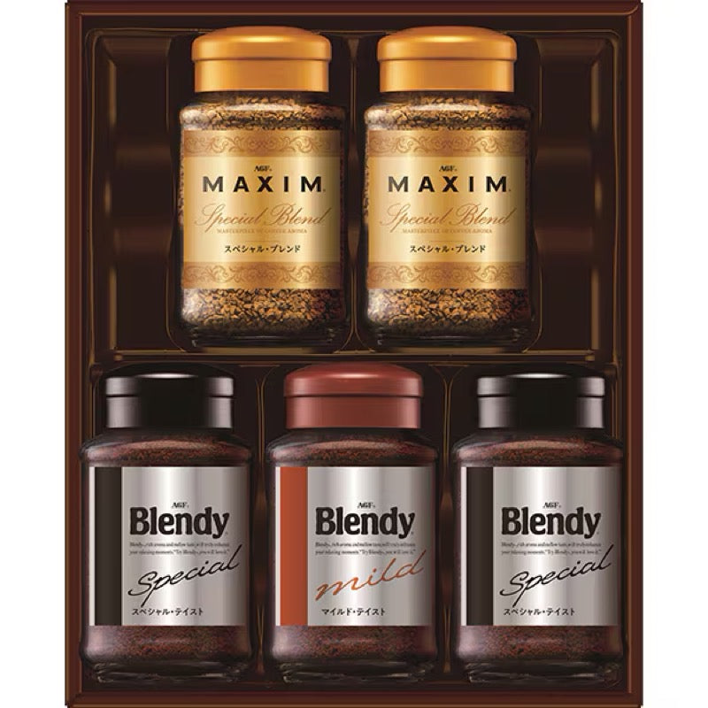 This instant coffee gift set is sure to please a wide range of people. It combines the mild-tasting Blendy Instant Coffee (Special Taste 70g x 2, Mild Taste 70g) with the fragrant, rich-tasting Maxim Instant Coffee Special Blend 65g x 2, adding variety to your daily coffee routine.