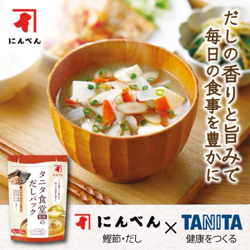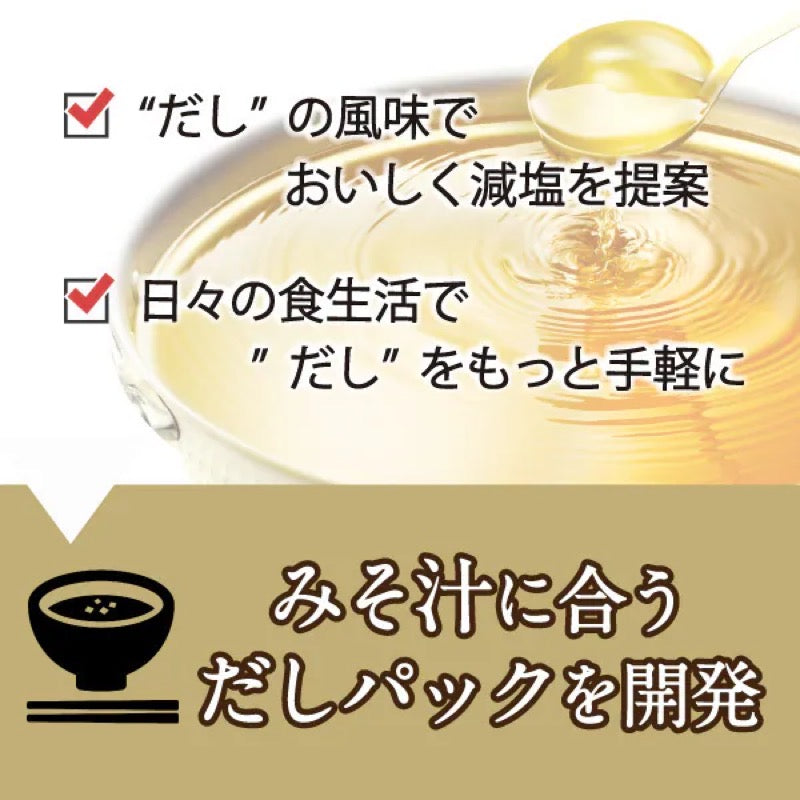 Enrich your daily meals with the aroma and flavor of dashi! With a desire to support daily health through dashi, an essential ingredient in Japanese cuisine, we have jointly developed, under the supervision of Tanita Shokudo, a dashi pack that is perfect for miso soup. To bring out the flavor and aroma of the ingredients, this pack contains no added salt or seasonings and is made with a carefully selected blend of three dashi ingredients: domestically produced bonito flakes, dried sardines, and kelp from Hokkaido.