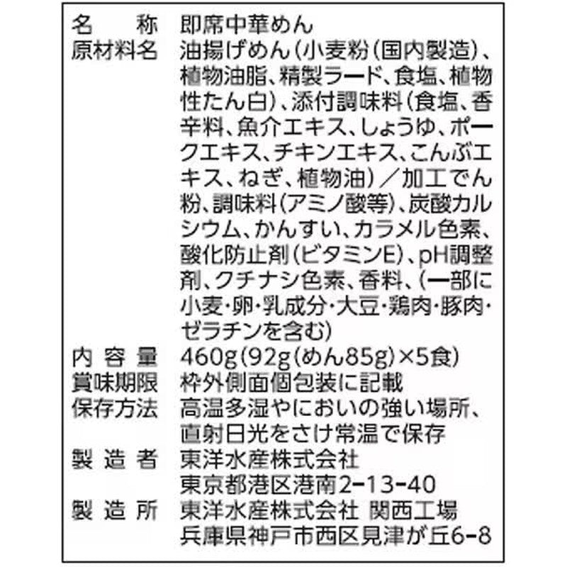 Contents:460g (92g (85g noodles) x 5 servings) Storage method:Store at room temperature away from high temperatures, humidity, strong odors, and direct sunlight. Seller:Toyo Suisan Co., Ltd. Manufacturer:Toyo Suisan Co., Ltd. Nutritional information:Per serving (92g). Energy 403kcal, protein 9.4g, fat 13.8g, carbohydrates 60.4g, salt equivalent 4.7g (noodles/ingredients 1.6g, soup 3.1g), calcium 202mg Allergen information:Wheat, eggs, milk products, soybeans, chicken, pork, gelatin |