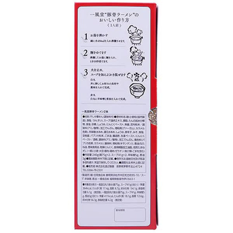 Name:Ippudo Tonkotsu Ramen (2 servings) Food allergies:Wheat, pork, chicken, soybeans, sesame, sardines Origin:Made in Japan |