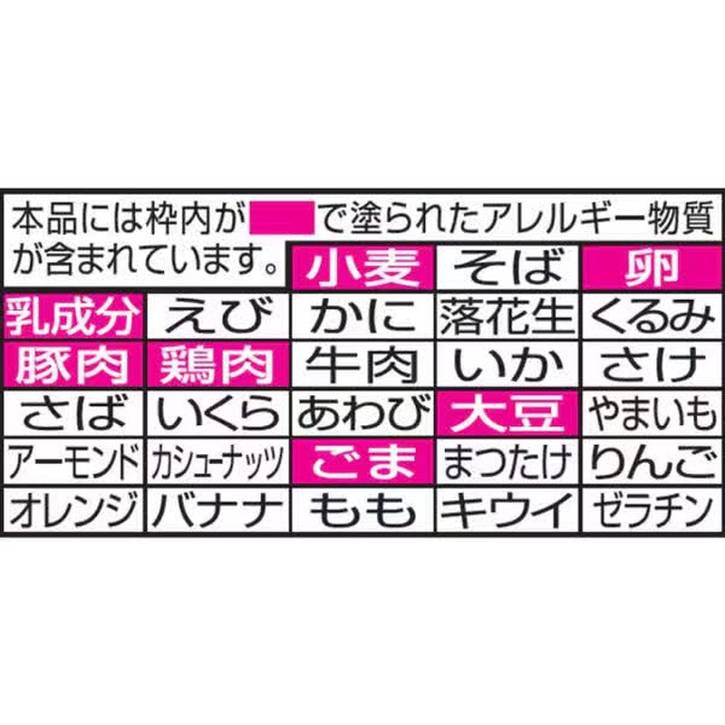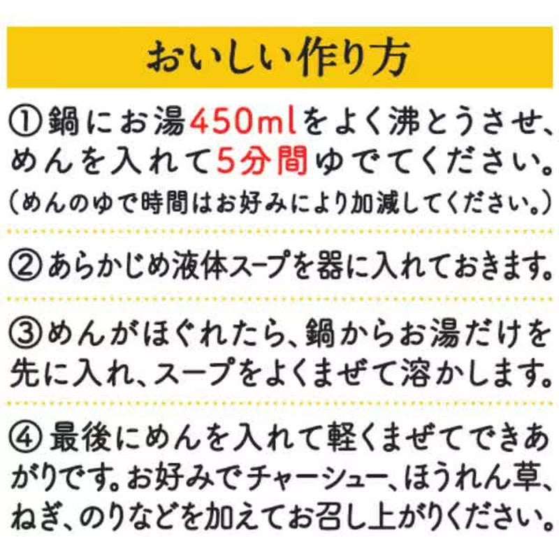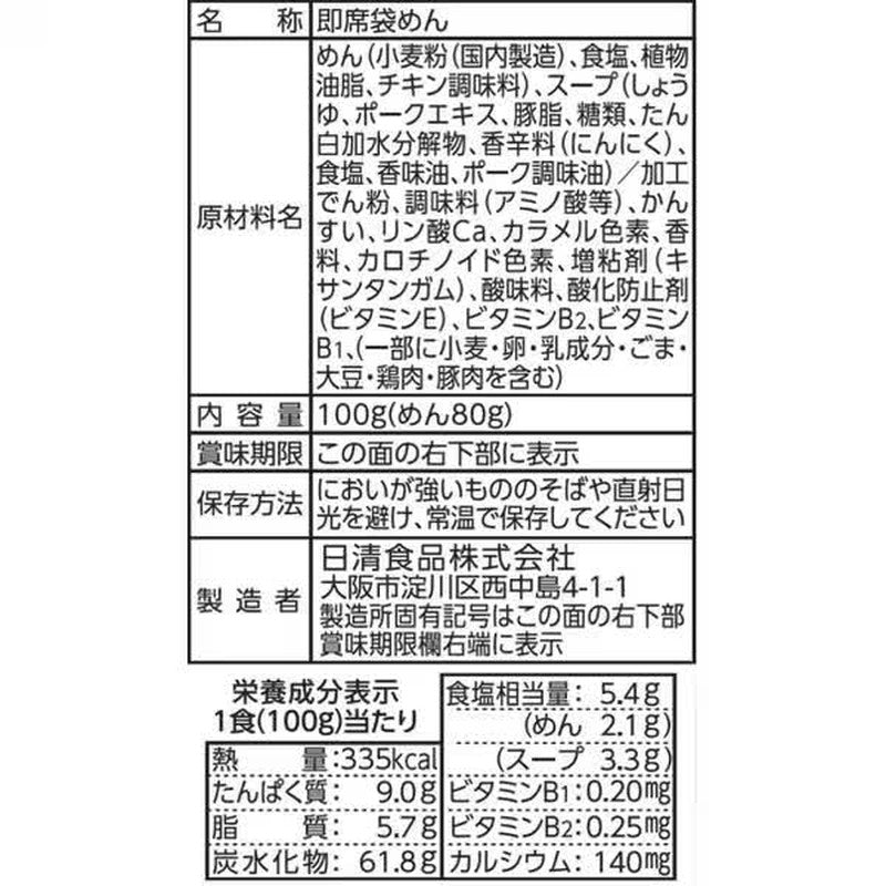 Ingredients: Noodles (wheat flour (domestically produced), salt, vegetable oil, chicken seasoning), soup (soy sauce, pork extract, lard, sugar, protein hydrolyzate, spices (garlic), salt, flavor oil, pork seasoning oil)/modified starch, seasoning (amino acids, etc.), kansui, calcium phosphate, caramel color, flavoring, carotenoid color, thickener (xanthan gum), acidulant, antioxidant (vitamin E), vitamin B2, vitamin B1, (contains wheat, egg, milk ingredients, sesame, soybeans, chicken, pork) Nutritional information (Per serving (100g)) Energy: 335kcal, Protein: 9g, Fat: 5.7g, Carbohydrates: 61.8g, Salt equivalent: 5.4g, Vitamin B1: 0.2mg, Vitamin B2: 0.25mg, Calcium: 140mg |