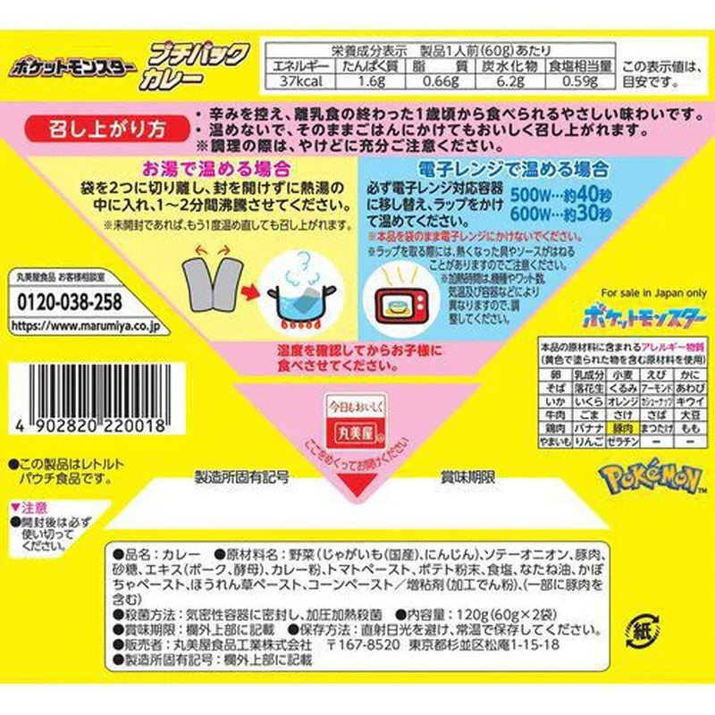 Product specifications for Marumiya Pokemon Petit Pack Curry Pork & Vegetable Mild Boxed 120g (60g x 2)