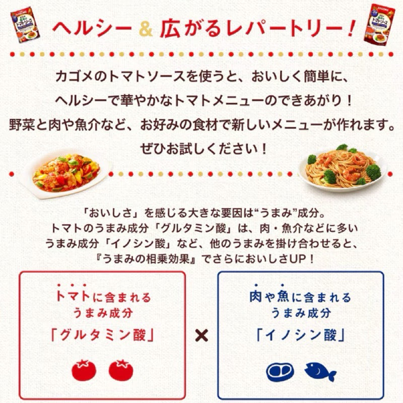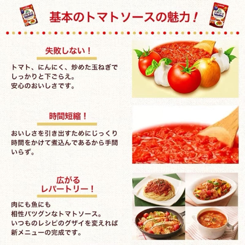 A rich and delicious tomato sauce, carefully simmered with sautéed onions. Contains 15% more onions than our previous product. This tomato sauce is packed with our chef's skill, so it's easy to elevate your everyday tomato dishes. We lightly season and simmer ripe tomatoes with onions, olive oil, garlic, and more. All you have to do is add your ingredients and season to your liking. Expand your repertoire with pasta, stews, and more. The light seasoning allows you to tailor it to your taste. It's versatile enough to be used in a variety of dishes, including pasta and stews, as well as curries and stews, or combined with other seasonings like mentsuyu (noodle soup base). Since the prep is already done, it saves you time and effort in the kitchen. Please note that the actual product and packaging may differ from what is shown.