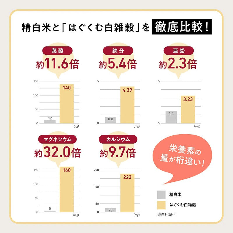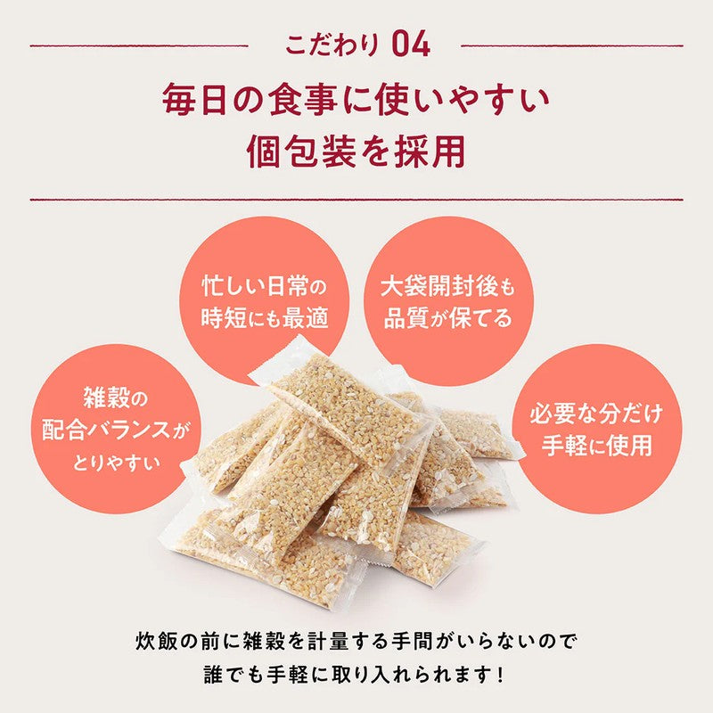 A protein-rich blend of six grains, designed for ease of consumption HOMTECH Hagukumu White Grains is a balanced blend of six grains rich in protein. Its white appearance makes it easy to incorporate into dishes, making it easy for even first-time grain eaters to incorporate into their daily meals. Its mild flavor makes it easy to continue consuming. Naturally add five nutrients to your daily diet Containing calcium, folic acid, iron, zinc, magnesium, and other nutrients essential for daily meals, the blend is carefully designed to be easily incorporated into your couple's diet, making it a recommended choice for those conscious of nutritional balance. White grains blend seamlessly into your cooking These white grains with a mild flavor are easy to incorporate into a variety of dishes, whether Japanese, Western, or Chinese, and can be mixed into rice or used in soups and salads. It's a perfect addition to your family's meals, expanding your ideas for enjoying everyday meals.