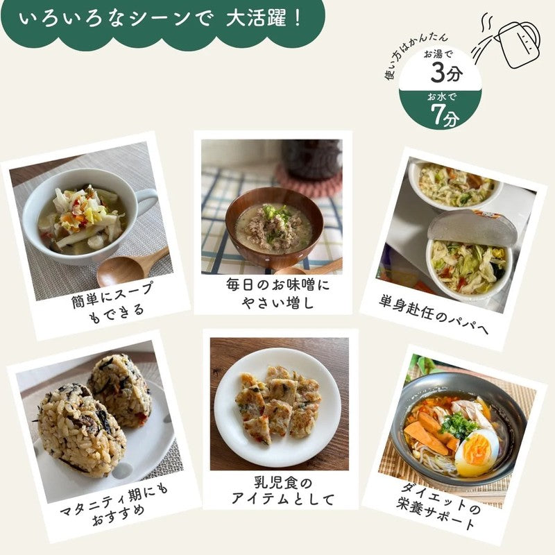 Easy to prepare, so you can quickly create a vegetarian dish. BEEMO is a dehydrated vegetable mix blended with six domestically grown vegetables (onion, cabbage, carrot, tomato, pepper, and celery). Simply rehydrate in water or hot water to create a vegetable dish, making it perfect for busy days. No knives or cutting boards are required, eliminating the need for prep. Convenient for versatile cooking. Rehydrated BEEMO can be used directly in a variety of dishes, from stir-fries to soups and pasta. Its crisp texture adds a touch of color and texture to dishes. Long-term storage. Recommended for stockpiling. BEEMO can be stored at room temperature for approximately 180 days, making it ideal for everyday use, camping, outdoor activities, office meals, and even emergency preparedness. You can take only the amount you need, so there's no waste. Preserves the natural flavor of the ingredients BEEMO preserves the natural flavor and color of the vegetables without adding the glucose and additives often used in dried vegetables. Enjoy the taste of carefully processed vegetables in the comfort of your own home.