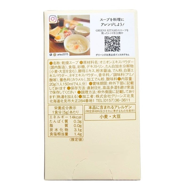 Storage Instructions: Store at room temperature, avoiding direct sunlight, high temperatures, and humidity. Best before date: Approximately 540 days. Ingredients: Onion extract powder (produced in Kitami, Hokkaido), salt, protein hydrolyzate (contains wheat and soybeans), yeast extract, sugar, chicken bouillon powder (contains milk ingredients), starch, spices, seasonings (amino acids, etc.), coloring (caramel), acidulant. Allergens: Contains wheat, milk ingredients, soybeans, and chicken. How to use: Place one packet (5g) in a cup, pour in approximately 150ml of boiling water, and stir well. Manufacturer: Greens Kitami Co., Ltd. (manufactured in Hokkaido). |