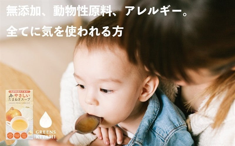 Free of 28 specific allergens, no animal ingredients, and no additives. Greens Kitami's "Gentle Onion Soup" does not contain any of the 28 specific allergens, and does not contain any animal ingredients.