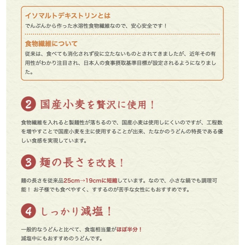 This thin udon noodle is formulated with water-soluble dietary fiber (isomaltodextrin) to easily supplement the dietary fiber often lacking in daily diets. Made primarily with domestic wheat and with a gentle texture, it is an easy dish to incorporate into your daily meals. One serving (100g) provides 7.4g of dietary fiber, and the short noodles make it easy to cook in a small pot. It also contains roughly half the salt equivalent of regular udon, making it a recommended low-sodium option. With a net weight of 200g and a boiling time of approximately 5-7 minutes, it can be stored at room temperature for extended periods.