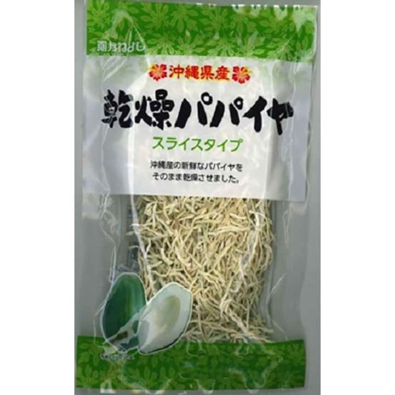 Fresh and dried papaya from Okinawa Prefecture. In Okinawa, papaya is eaten as a vegetable by cutting it into strips and stir-frying it. Serves approximately 2 people. Soak in water for about 5 minutes.