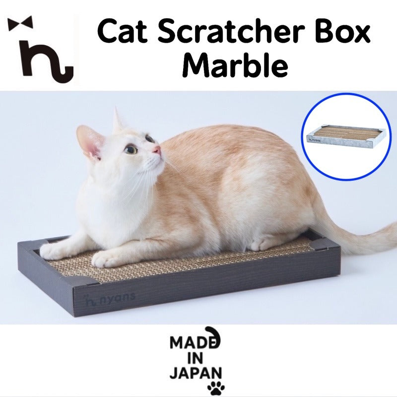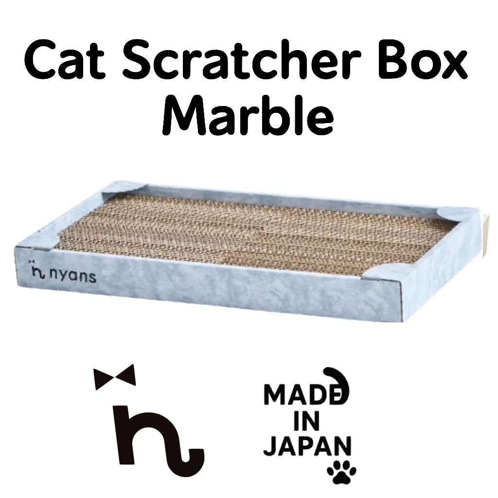 This compact box-type cat scratcher from nyans features a marble pattern design. Made from Japanese reinforced cardboard with virgin pulp, it creates minimal debris and is three times more durable than regular scratchers. Double-sided and refillable for long-term use. Ideal for cats up to 5kg.
