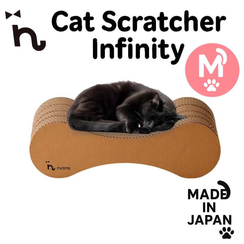 This infinity-shaped cat scratcher from nyans features double curves on both sides that cats love. Designed for scratching and relaxing, it uses high-strength Japanese reinforced cardboard with virgin pulp for minimal debris and triple durability. Both sides can be used for longer life.