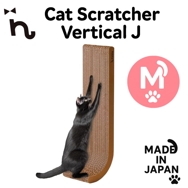 This vertical J-shaped cat scratcher from nyans offers three ways to use: upright, curve up, or curve down. Made from premium Japanese reinforced cardboard with virgin pulp, it creates minimal debris. Both sides can be used for extra durability.