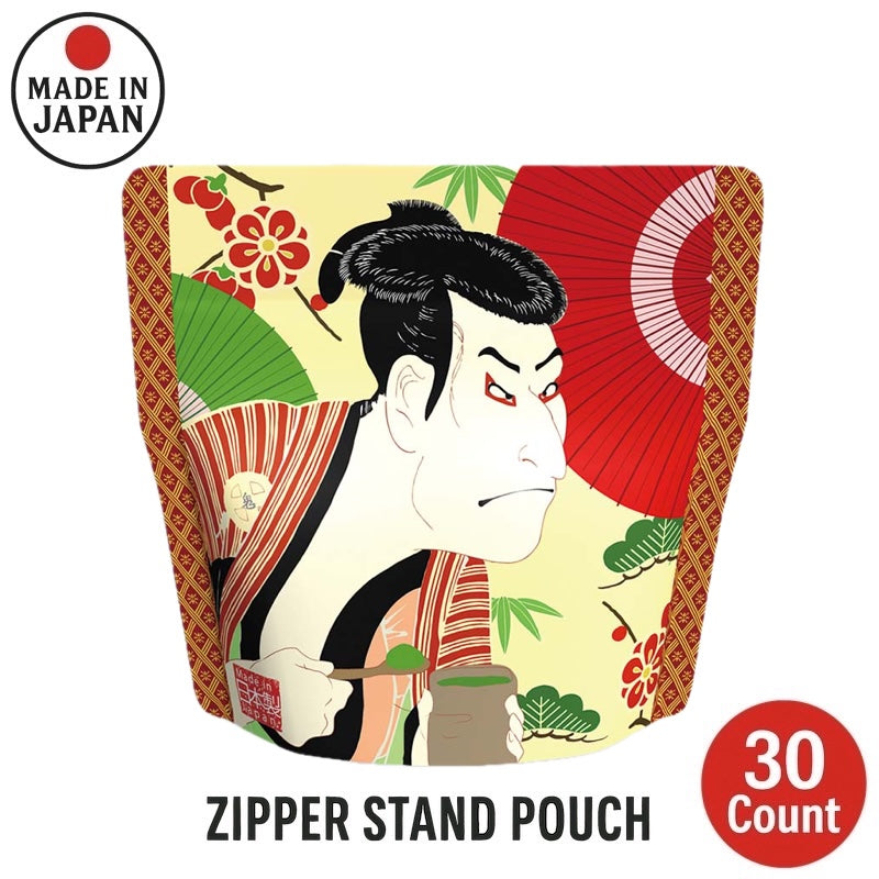 Set of 30 Japanese zipper stand pouches featuring an Edobee design inspired by traditional ukiyo-e art. Made from aluminum. Each pouch is individually packaged.