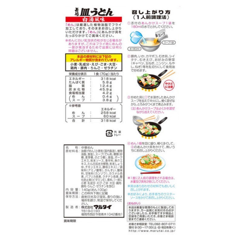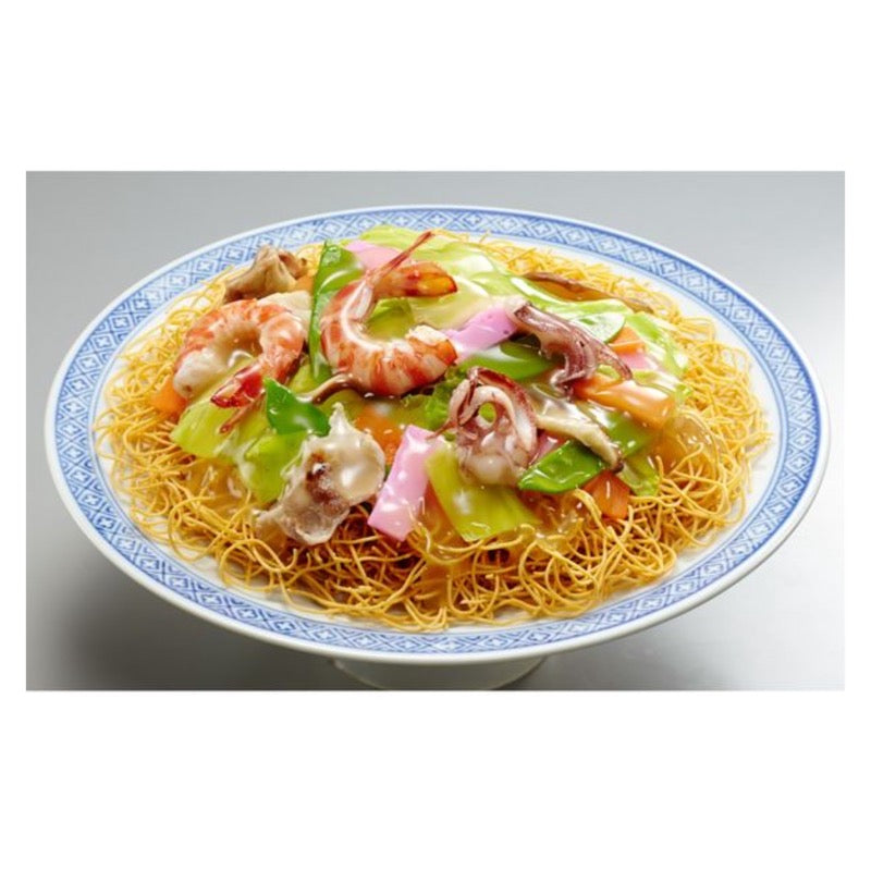 面条是用 100% 植物油炒制的细脆面条。Ankake 汤以肉/海鲜提取物、酱汁、酱油、糖和各种香料为基础,用淀粉勾芡,具有热水风味。这是 45 周年纪念套餐。