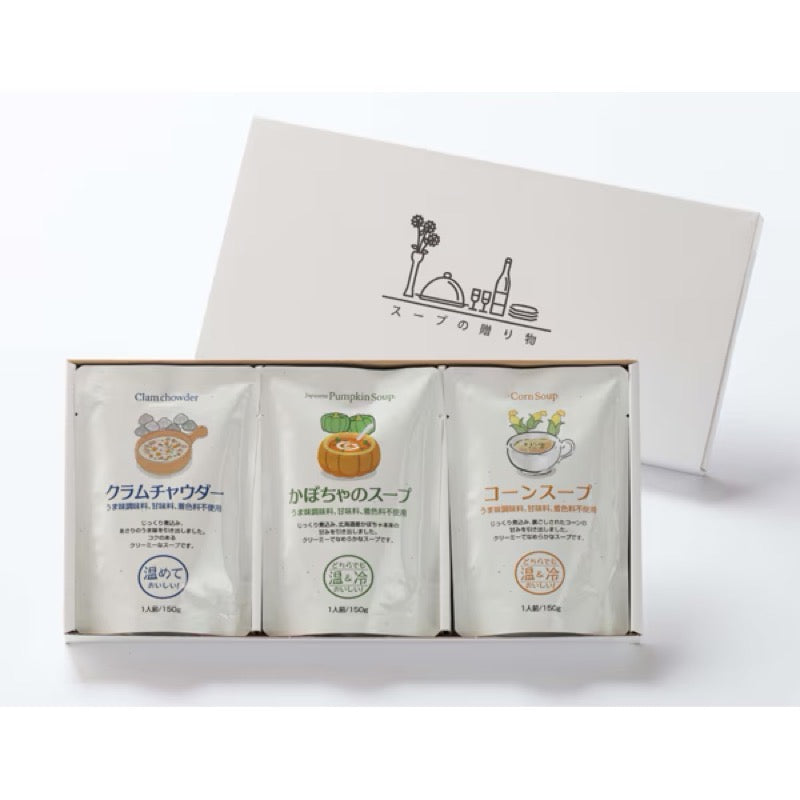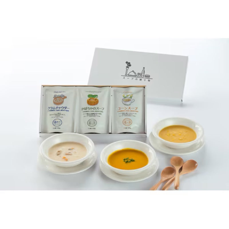 无需加热 南瓜汤和玉米汤即使不加热也很好吃。 蛤蜊浓汤 慢火熬煮,带出蛤蜊的鲜味。这是一款浓郁顺滑的汤。 南瓜汤 慢火熬煮,充分激发北海道南瓜的天然甜味。这是一款口感顺滑浓郁的汤,即使不加热也美味可口。 玉米汤 慢火熬煮,带出玉米泥的甜味。这是一款口感顺滑浓郁的汤。即使不加热也美味可口。