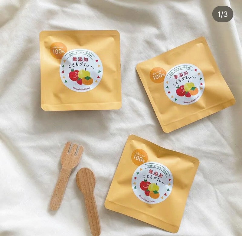 Fresh fruit from Wakayama Prefecture transformed into colorful gummy candies! "Additive-Free Children's Gummies" are made with 100% fruit from Katsuragi Town, Wakayama Prefecture. Wakayama Prefecture is known as the Fruit Kingdom, where delicious fruit is grown in every season. Sun-ripened fruit is dried and then transformed into colorful gummy candies using special techniques. You can enjoy the fruit's natural sweetness and flavor intact. Additive-Free and Safe! A Gentle Snack for Kids "Additive-Free Children's Gummies" are made with fruit from Wakayama Prefecture and contain no gelatin, colorings, or flavorings, and are free of sugar or preservatives. The natural sweetness of Wakayama fruit creates a natural, gentle flavor. A safe, additive-free snack that mothers will love. Contributes to the SDGs! Reducing food waste by upcycling fruit from Wakayama. "Additive-free Children's Gummies" are made by upcycling discarded fruit grown in Wakayama. Our unique drying technology ensures that fruit is used without waste, transforming it into delicious gummy treats and contributing to reducing food waste. These environmentally friendly gummy treats also take SDGs into consideration.