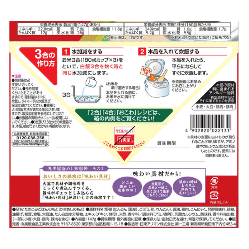 這是一道豐盛的鍋飯,裡面有8種食材(胡蘿蔔、牛蒡、竹筍、雞肉、蒟蒻、炸雞、香菇)。