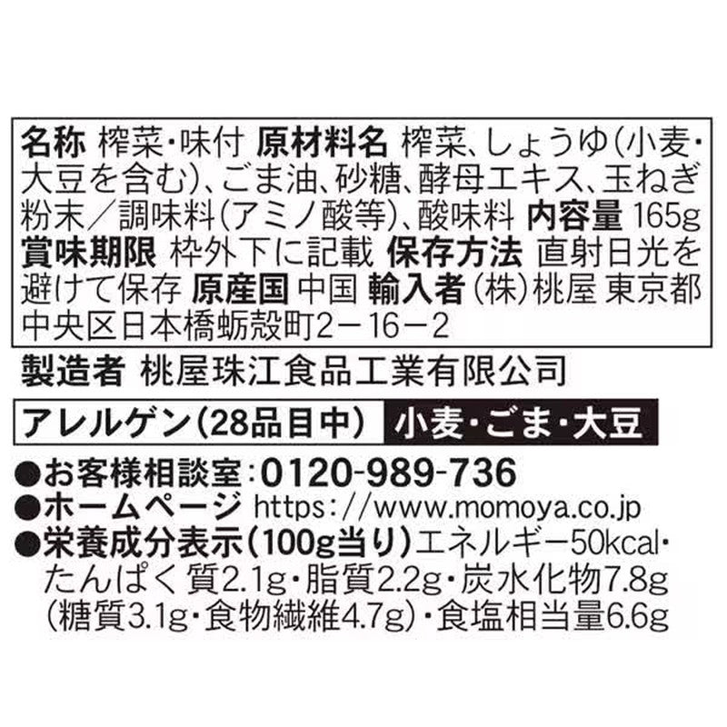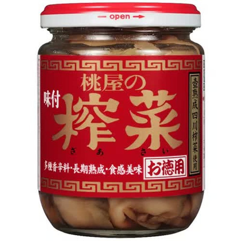 桃屋的「調味榨菜超值裝 165克」是一款瓶裝產品,採用四川傳統制法,將榨菜在祭壇裡發酵熟成約一年,並用芝麻油和醬油調味而成。原料是一種名為大車菜的芥菜頭,經過風乾、鹽漬、乳酸發酵,以及十餘種香料調味,最後慢慢熟成。 最後加入芝麻油和醬油,使其味道濃鬱芬芳。它可以輕鬆用作米飯的配菜、開胃菜,或作為炒菜和沙拉的配料。