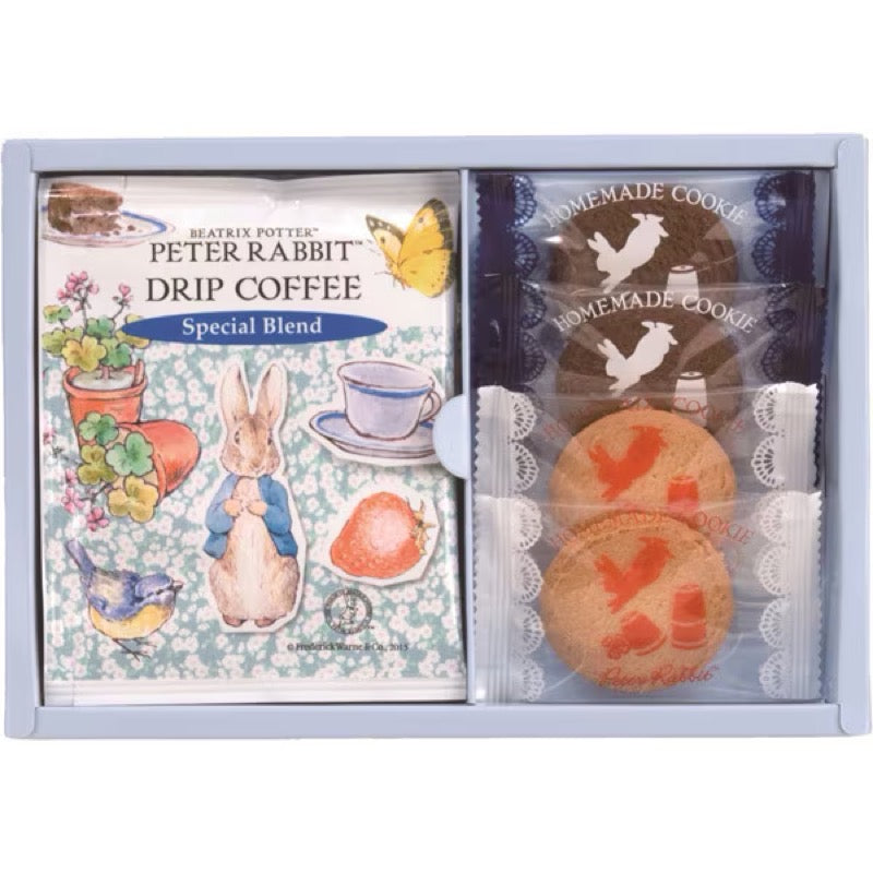 彼得兔多年來一直深受喜愛。這款滴濾咖啡和甜點套裝以可愛的彼得兔為主題,周圍環繞著花卉圖案。