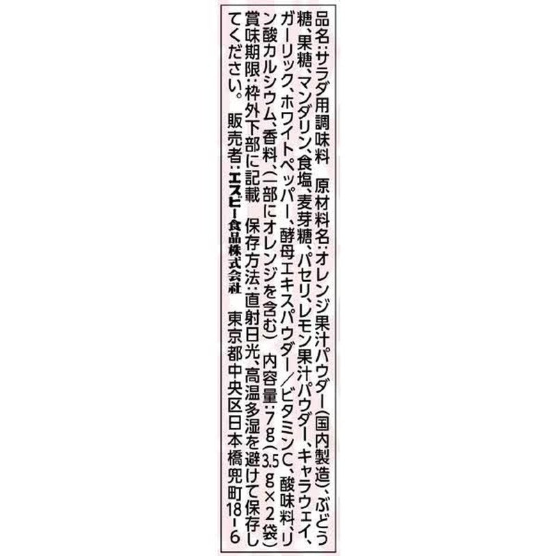Ingredients: Orange juice powder (made in Japan), glucose, fructose, mandarin, salt, maltose, parsley, lemon juice powder, caraway, garlic, white pepper, yeast extract powder/vitamin C, acidulant, calcium phosphate, flavoring (contains orange). Net weight: 7g Storage: Store away from direct sunlight, high temperatures, and humidity. Nutritional information (per bag (3.5g)): Energy 13kcal, protein 0.1g, fat 0.1g, carbohydrates 2.8g, salt equivalent 0.5g. Allergen information: Contains ingredients including "orange." |