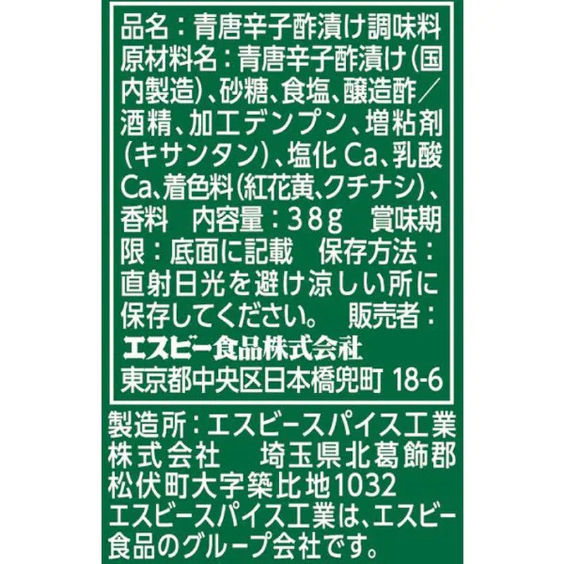 Ingredients: Pickled green chili peppers (made in Japan), sugar, salt, brewed vinegar/alcohol, modified starch, thickener (xanthan), calcium chloride, calcium lactate, coloring (safflower yellow, gardenia), flavoring Net weight: 38g Storage: Store in a cool place away from direct sunlight. Nutritional Information: Per 10g: Energy 6kcal, Protein 0g, Fat 0g, Carbohydrates 1.4g, Sodium Equivalent 0.5g Allergen Information: None |