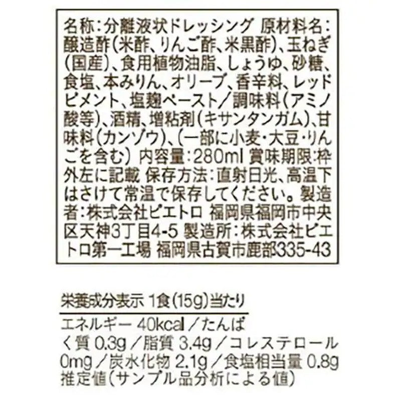 Pietro's "Pietro Dressing Onion Rich 280ml" is made with the largest amount of domestically grown onions in Pietro's history, featuring large, coarsely chopped onions with a crunchy texture. It's a blend of three types of vinegar: rice vinegar, apple cider vinegar, and black vinegar, and its mellow acidity and rich aroma bring out the umami of the onions. The rich flavor has a refreshing vinegar aftertaste, making it recommended not only for salads but also as a sauce for meat and seafood dishes. The bottle contains 280ml, and it's recommended to store it in the refrigerator after opening and use it as soon as possible.