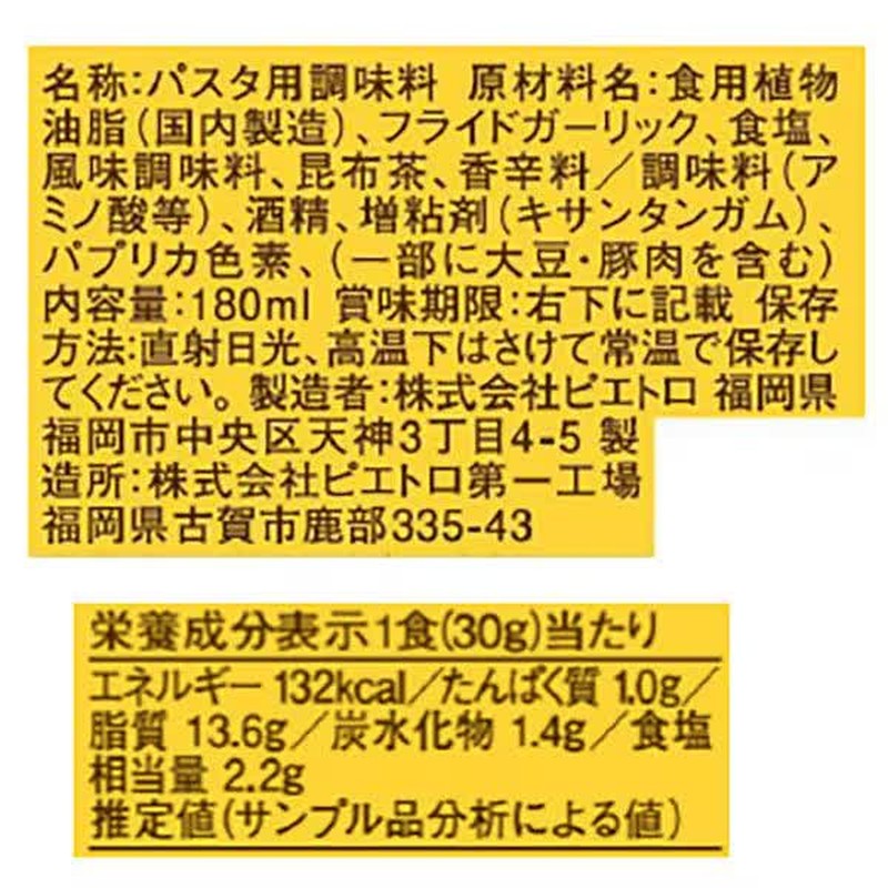Pietro's "Homemade Pasta Peperoncino 180ml" is a pasta sauce that lets you easily enjoy authentic Japanese-style peperoncino with the spiciness of garlic and chili peppers. All you need is this one bottle to season your pasta, and simply mix it with boiled pasta for a professional-quality taste. Richly flavored with kombucha tea, fried garlic, and spices, it's a popular all-purpose seasoning that can be used in a variety of dishes, including fried rice and sauteed cabbage and pork. Each bottle makes about six servings, making it convenient for when you're busy or want to take it easy.