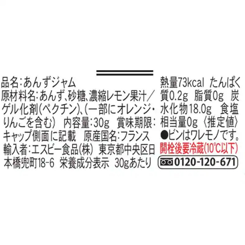 Ingredients:Apricots, sugar, lemon juice concentrate/gelling agent (pectin), (contains orange and apple) Net weight:30g Storage:Store away from direct sunlight, high temperatures, and humidity. Nutritional information:Per 30g. Energy 73kcal, Protein 0.2g, Fat 0g, Carbohydrates 18.0g, Sodium Equivalent 0g Allergen Information: Contains ingredients including orange and apple. |