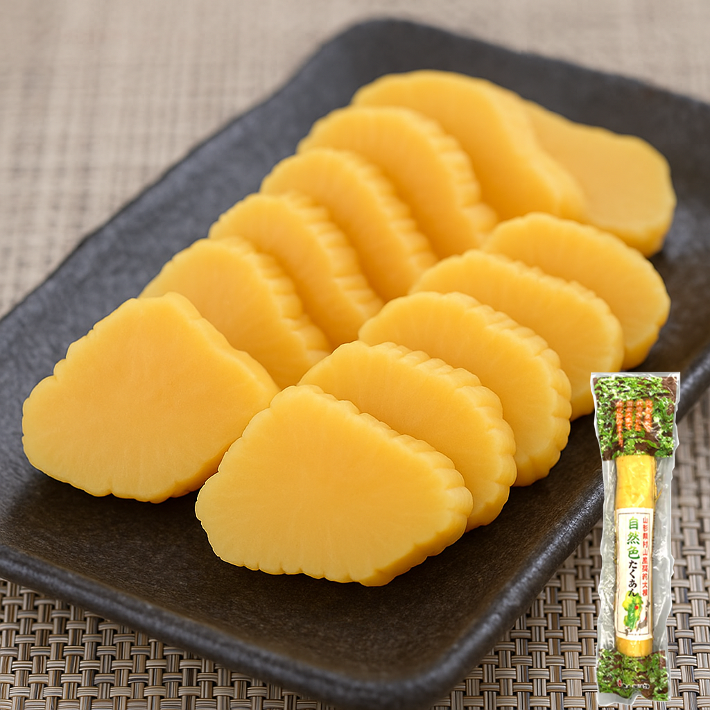 蘿蔔經過鹽壓,用米糠、味醂、鰹魚萃取物和發酵調味料醃製,呈現出天然的金黃色澤和濃鬱的鮮味。